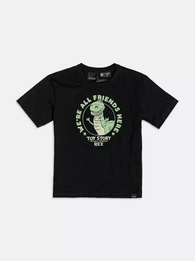 Cheia de atitude, a camiseta preta traz estampa estilizada do dinossauro Rex. Ideal para meninos criativos e apaixonados pelo universo jurássico. Ref.: I2184