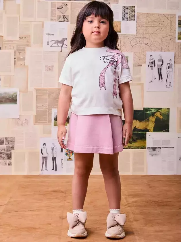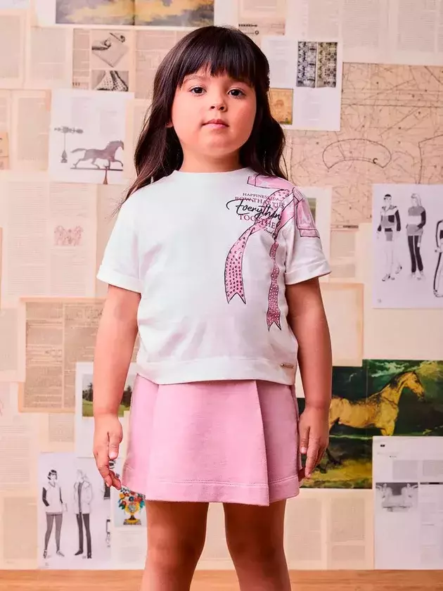Delicadeza e elegância em um look apaixonante! A blusa off white traz uma estampa sofisticada de laço com aplicação de strass e lettering charmoso, adicionando um toque romântico. O short saia rosa complementa a produção com sua modelagem estruturada e fluída, garantindo conforto e um visual encantador para diversas ocasiões. Ref.: P6090