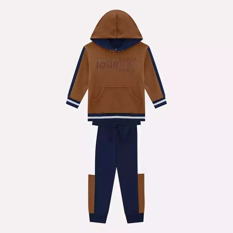 A calça, também em moletom peluciado, possui elástico na cintura, garantindo ajuste confortável e praticidade no vestir. Seu corte básico e atemporal combina perfeitamente com o casaco, criando um conjunto harmonioso, ideal tanto para momentos de lazer quanto para passeios descontraídos. O conjunto une qualidade, conforto e estilo em uma proposta casual e versátil, perfeita para meninos cheios de energia que gostam de se vestir com atitude e liberdade.