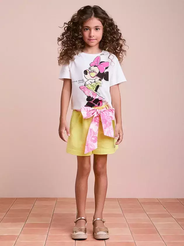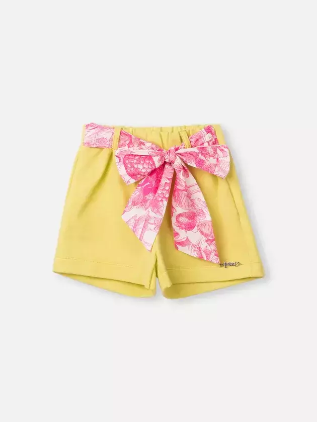 Short infantil amarelo em malha macia, com cós de elástico e faixa rosa estampada em laço, detalhe que garante charme e modernidade ao look. A peça é prática e confortável, ideal para composições alegres e sofisticadas do verão. Versátil, combina com blusas lisas ou estampadas, criando produções casuais ou delicadas com o toque fashion da Animê. Ref.: N4976